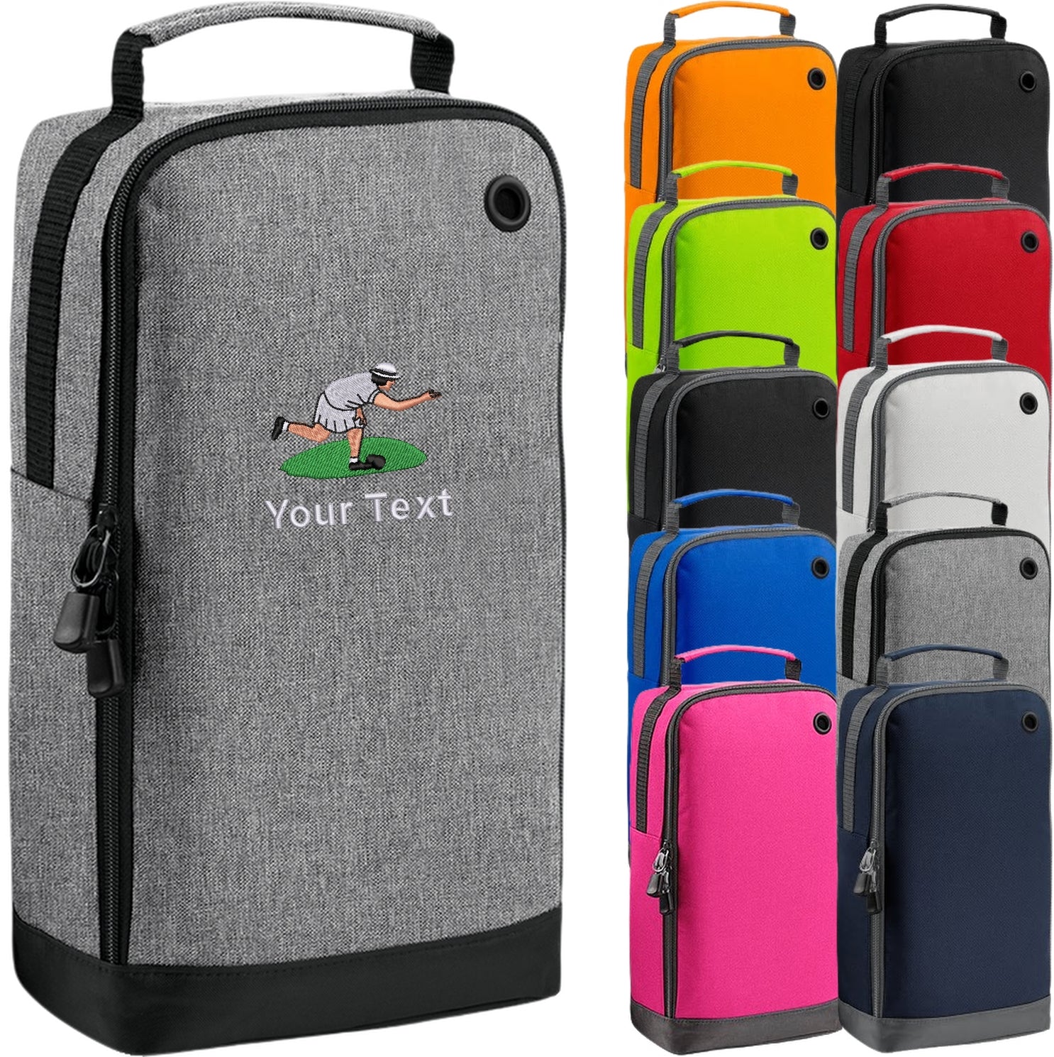 Crown green or flat green bowls lady embroidered on a shoe bag. Choose your bag colour and personalise your bag with your own embroidered text in your choice of thread colours.