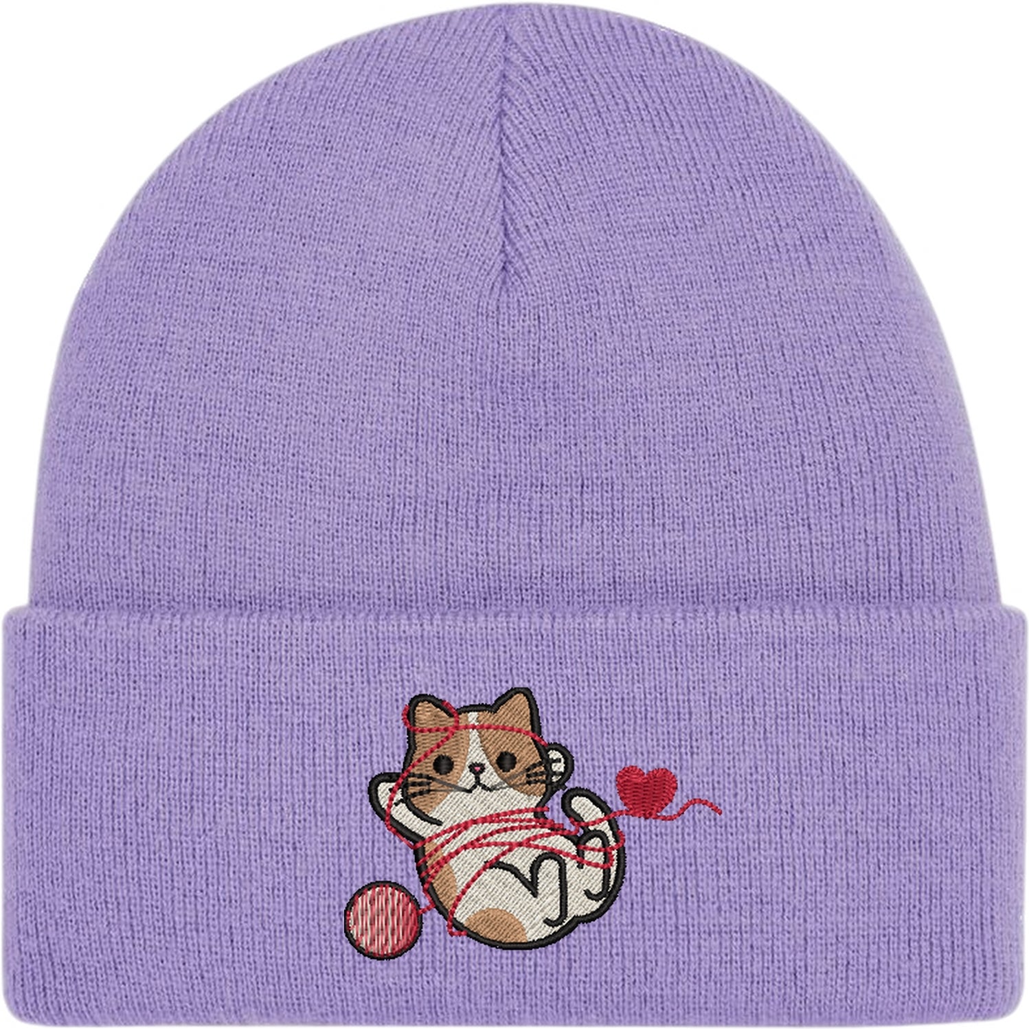 Little cat playing with red string embroidered on a double knit beanie. Massive range of colours to choose from.